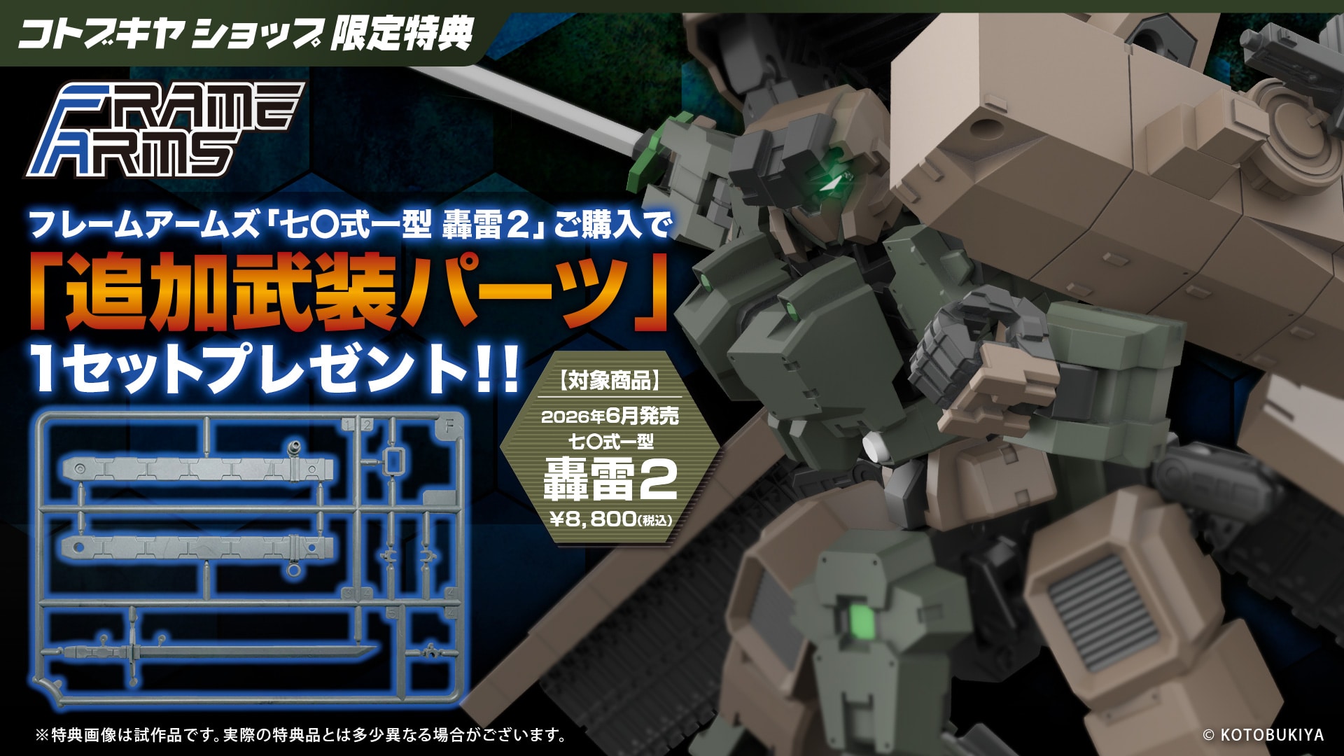 コトブキヤショップ限定特典「追加武装パーツ」※ご予約いただいた方には、必ず特典をお付けいたします。※特典付アイコンや限定特典の表記が商品ページから無くなりますと、配布終了となりますのでご注意ください。※コトブキヤショップ購入特典は、商品の再生産時や海外販売および、イベントや臨時出店等の企画により、直営ショップ以外で付属、配布させていただく場合がございます。