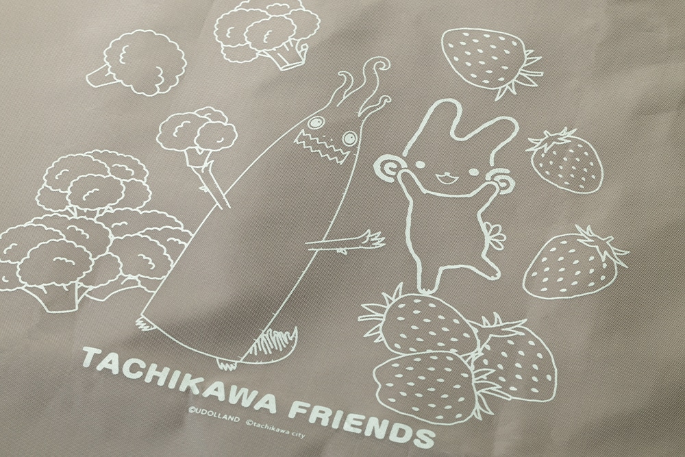 バッグの正面には立川の推し野菜と果物「ブロッコリー」と「イチゴ」に囲まれたウドラとくるりんがデザインされ、シンプルながら可愛らしい仕上がりになっております。