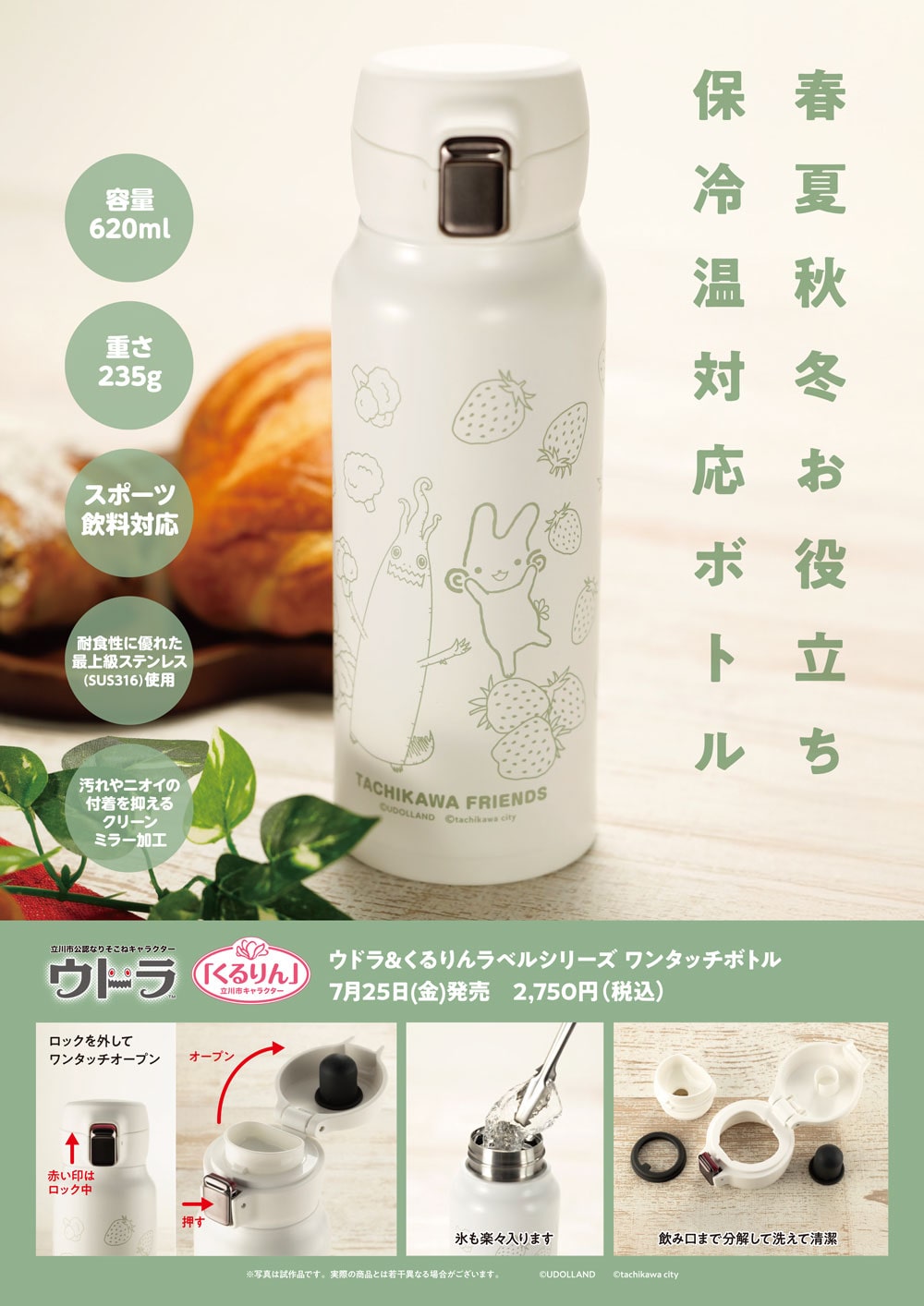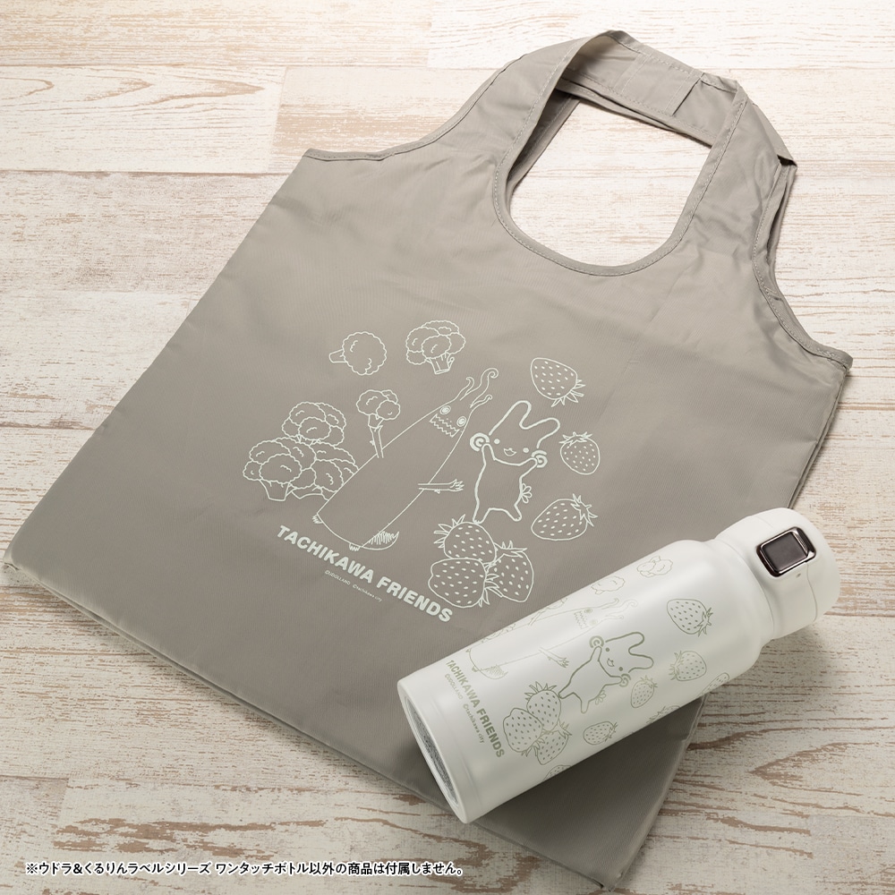 ボディには、立川の推し野菜と果物「ブロッコリー」と「イチゴ」に囲まれたウドラとくるりんがデザインされ、シンプルながら可愛らしい仕上がりになっております。