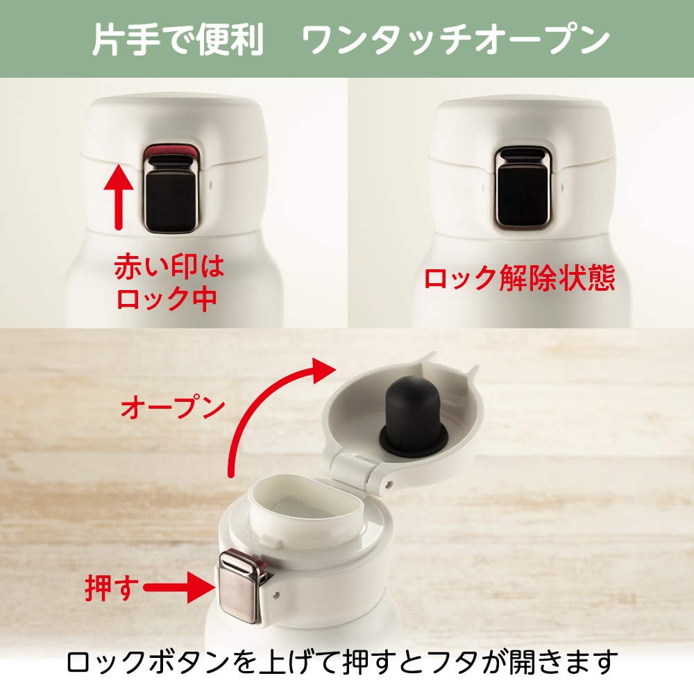 ワンタッチでロック解錠ができ、片手で簡単に飲料することできます。